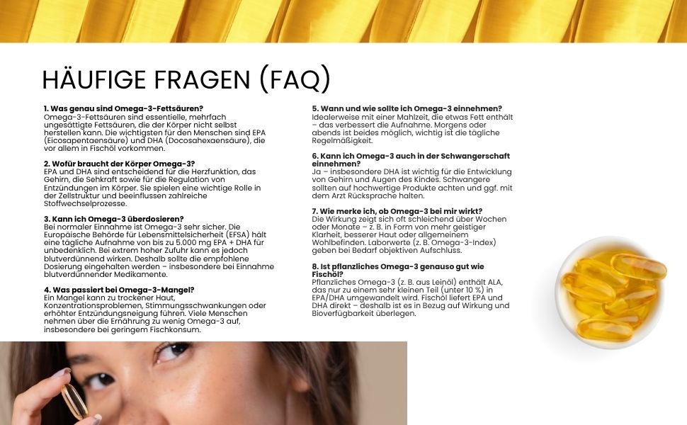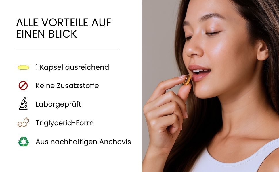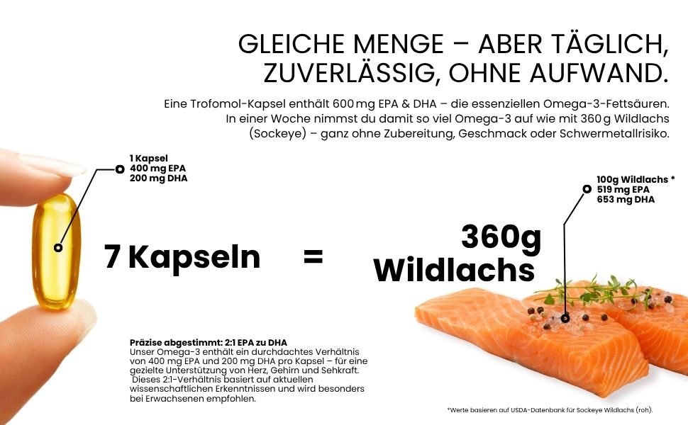 Unsere hochwirksamen Kapseln enthalten eine gezielte Kombination von 400 mg EPA und 200 mg DHA pro Kapsel. Diese essenziellen Omega-3-Fettsäuren sind in klinischen Studien umfassend untersucht worden und unterstützen nachweislich die Herzfunktion sowie die kognitive Leistung und Sehkraft. Vertrauen Sie auf die Empfehlungen der Europäischen Behörde für Lebensmittelsicherheit (EFSA).