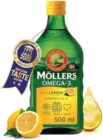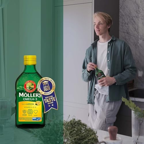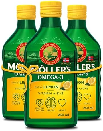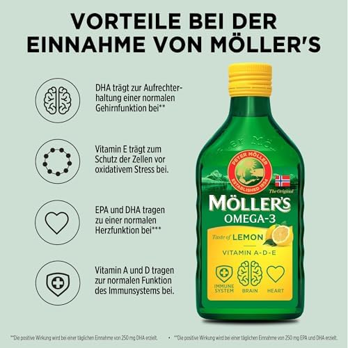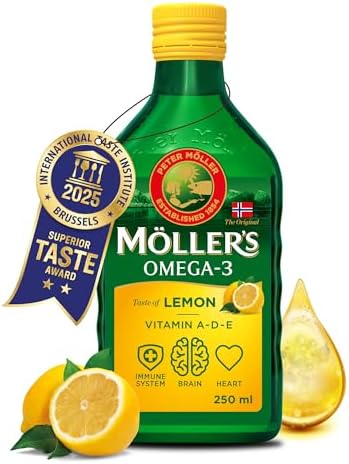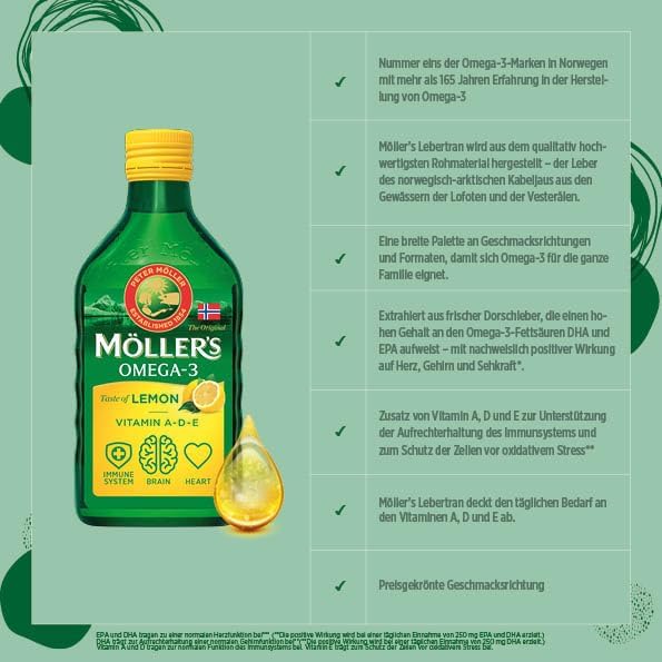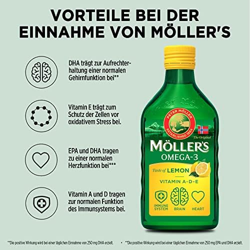 Möller's Omega 3 Lebertran Öl mit EPA, DHA & Vitaminen – Zitrone für verbesserten Geschmack, 250 MLMöller’s Omega 3 Lebertran Öl mit EPA, DHA & Vitaminen – Zitrone für verbesserten Geschmack, 250 ML