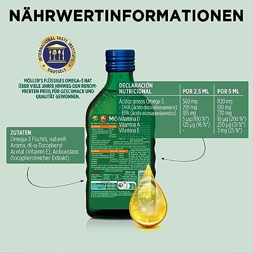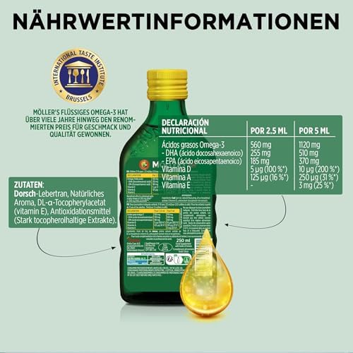 • Gluten- und laktosefrei: Ideal für Menschen mit Nahrungsmittelunverträglichkeiten; Möller’s Lebertran ist frei von Gluten und Laktose.