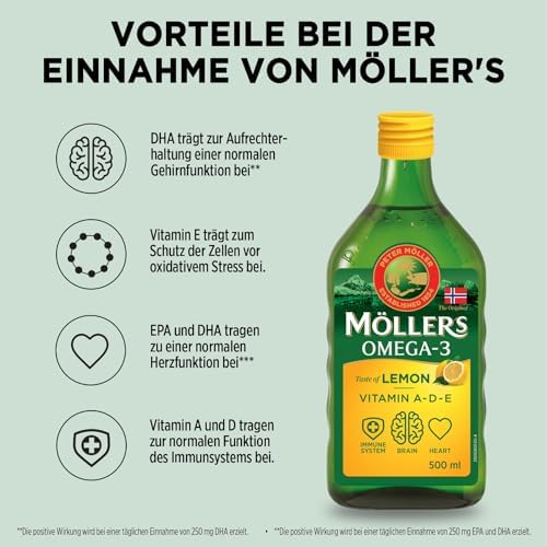 Möller’s Omega 3 Lebertran Öl mit EPA, DHA & Vitaminen – Zitrone für verbesserten Geschmack, 250 ML