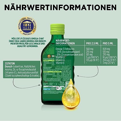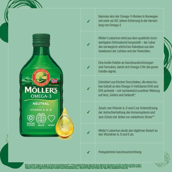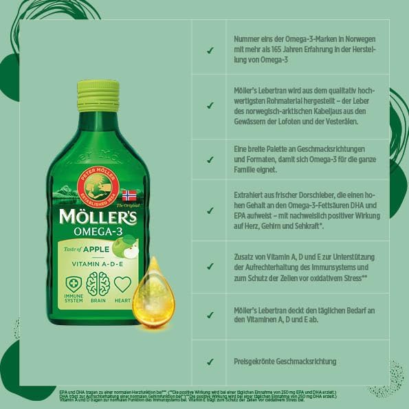 • Einfach köstlich: Genießen Sie den angenehmen Geschmack von Möller’s Lebertran als Teil Ihrer täglichen Gesundheitspflege.