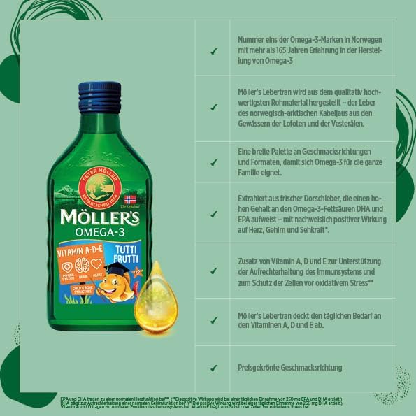 Jeder Mensch benötigt lebenslang Omega-3-Fettsäuren, um optimal zu funktionieren. Diese essenziellen Fettsäuren können vom Körper nicht selbst produziert werden und sind in Möller’s intensivem Lebertran reichlich vorhanden. Sie sind entscheidend für die Aufrechterhaltung Ihrer allgemeinen Gesundheit und Ihres Wohlbefindens.