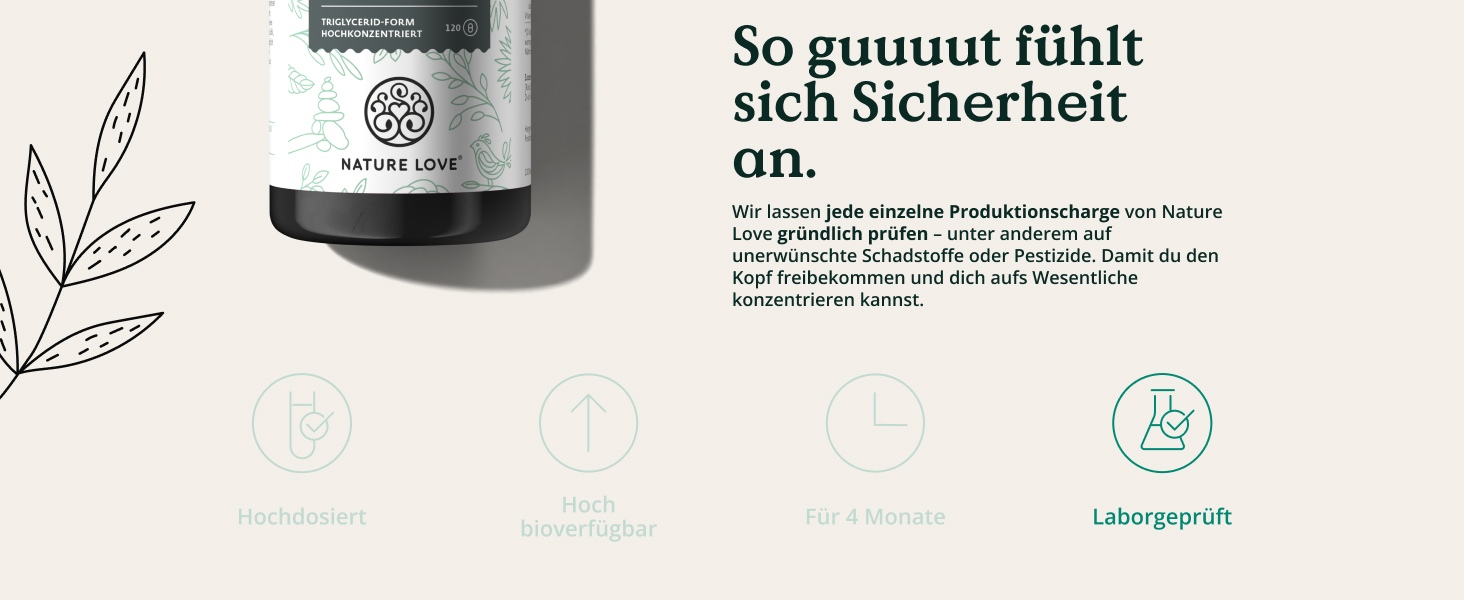 Schreiben Sie die erste Rezension für «Nature Love Premium Omega 3 Kapseln 120 Stk. – 1000mg Fischöl, hochdosiert & nachhaltig, für optimale Gesundheit»