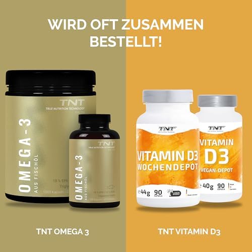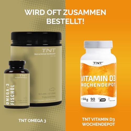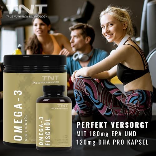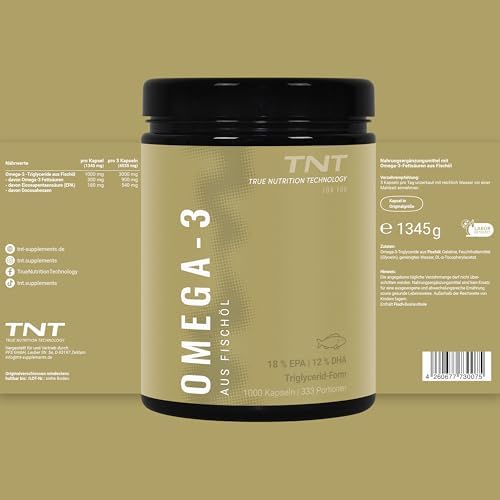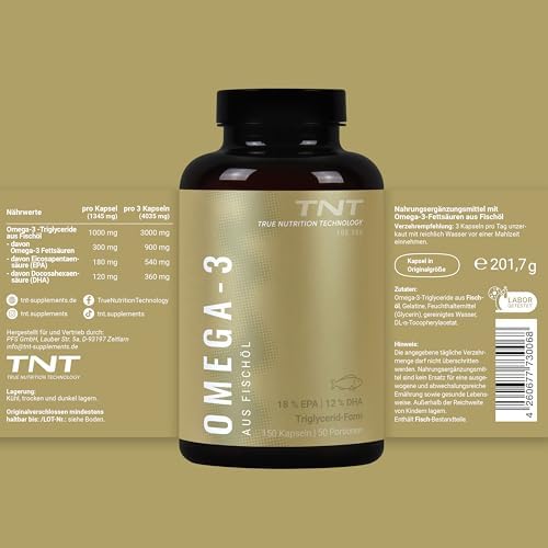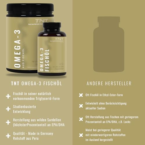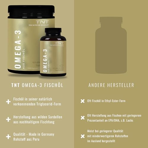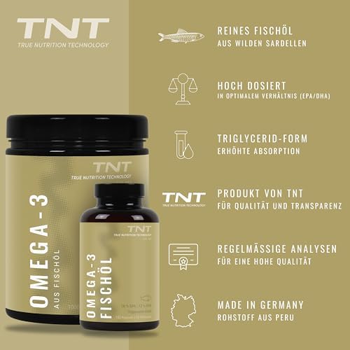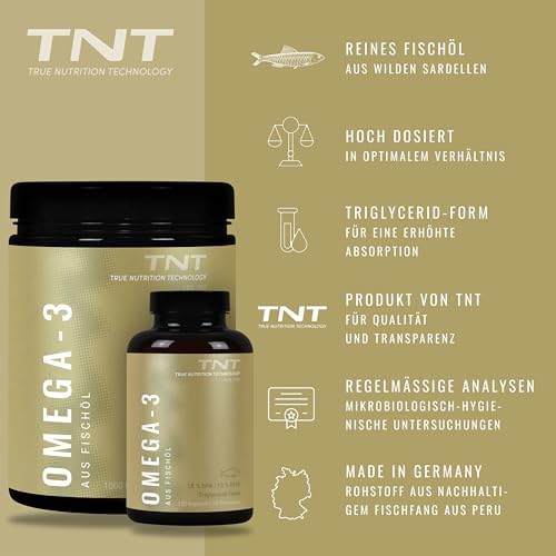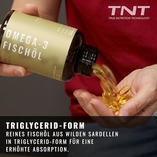 Unsere TNT Omega 3 Kapseln bestehen ausschließlich aus reinem Fischöl, das aus wilden Sardellen aus dem Südpazifik (Peru) gewonnen wird. Dieses hochwertige Produkt liefert Ihnen täglich 540 mg EPA und 360 mg DHA, was einer Gesamtdosis von 2760 mg Fischöl entspricht. Da Omega-3-Fettsäuren für den Körper essentiell sind und nicht selbst hergestellt werden können, ist eine zusätzliche Zufuhr über Nahrungsergänzungsmittel wichtig.