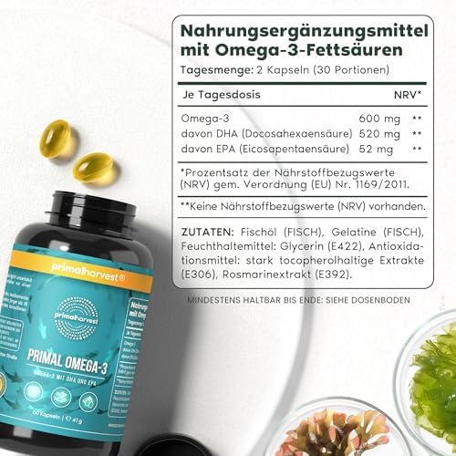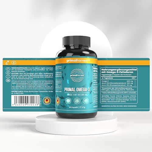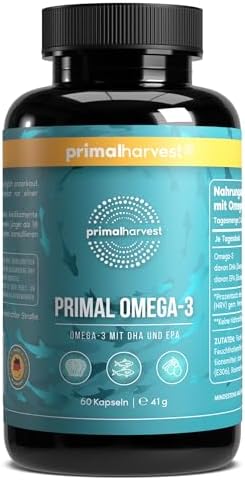 Primal Harvest ® Omega 3 Fischöl Kapseln - Hoher EPA & DHA Gehalt für Herzgesundheit, 30 Portionen, leicht zu schluckenPrimal Harvest ® Omega 3 Fischöl Kapseln – Hoher EPA & DHA Gehalt für Herzgesundheit, 30 Portionen, leicht zu schlucken