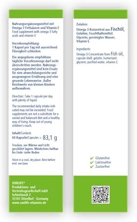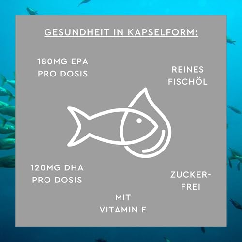 Jede Kapsel enthält 1000 mg hochwertiges Omega-3-Konzentrat aus Fischöl, das reich an wichtigen Fettsäuren ist. Mit 180 mg Eicosapentaensäure (EPA) und 120 mg Docosahexaensäure (DHA) bieten unsere Kapseln einen bedeutenden Beitrag zu Ihrer täglichen Nährstoffzufuhr. Ergänzt wird die Formel durch 5 mg Vitamin E, das weitere gesundheitliche Vorteile bietet.